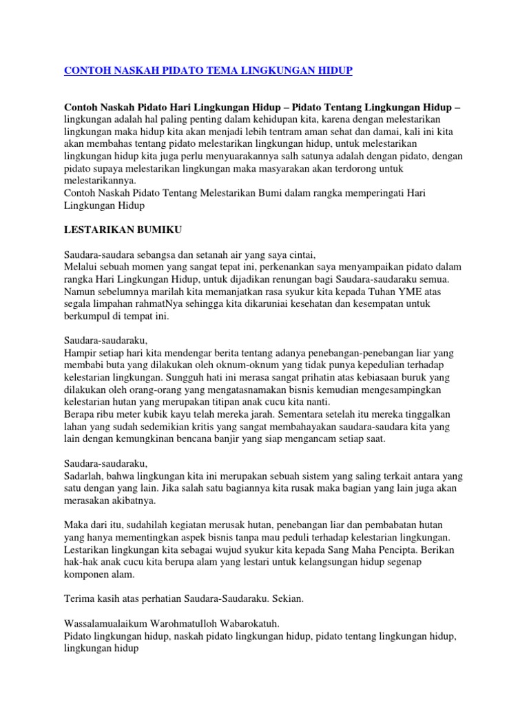 903 am herlambang priyo trapsilo no comments pidato lingkungan hidup. Contoh pidato lingkungan hidup menjaga keberhihan lingkungan assalamualaikum wrwb yth. Contoh naskah pidato tentang lingkungan hidup saudara saudara sebangsa dan setanah air yang saya cintai melalui sebuah momen yang sangat tepat ini perkenankan saya menyampaikan pidato dalam rangka hari lingkungan hidup untuk dijadikan renungan bagi saudara saudaraku semua.