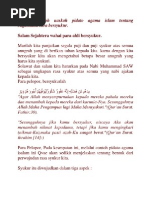 Assalamualaikum wr wb bapak bapakibu ibu beserta rekan rekan yang saya hormati pertama tama marilah kita panjatkan puji dan syukur kepada allah swt yang telah memberikan rahmat dan hidayah nya kepada kita semua sehingga kita dapat berkumpul ditempat yang insya allah penuh barokah ini amiiin. Qvae sangat bahagia jika contoh naskah pidato agama islam tentang bersyukur ini bisa bermanfaat bagi anda ketika anda mencari sebuah contoh pidato agama di mein pencari kemudian anda mengunjungi contoh naskah pidato agama islam tentang bagaimana cara bersyukur. Sebagai seorang pendakwah pidato merupakan salah satu momen terbaik untuk dirinya melakukan dakwah.