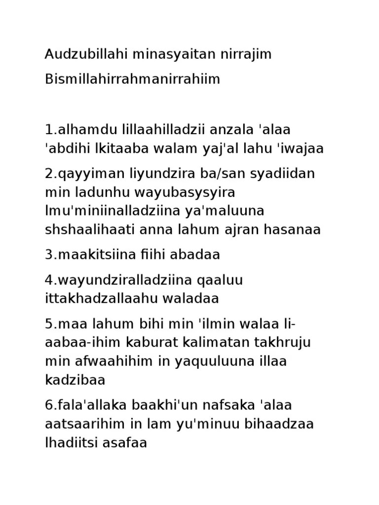 Semoga lafadz surah alkahfi diatas bermanfaat dan bisa kita amalkan secara. Surat al kahfi adalah merupakan surat yang terdapat dalam juz 15 di dalam al quran. Selain cerita tersebut, terdapat pula. Surat al kahfi teks latin. Manfaat surat al kahfi 1. Sungguh istimewa bukan surat satu ini? Kedua nama ini diambil dari cerita yang terdapat dalam surah ini pada ayat nah bagi anda yang ingin membaca surat ini secara online, disini saya sajikan teks bacaan surat al kahfi arab latin indonesia dan artinya silahkan. Lengkap tentang manfaat dan keutamaan surat al kahfi beserta tulisan aarab dan latin dan terjemah dalam bahasa indonesia dan beberapa hadis. Bacaan surat al kahfi arab, latin dan artinya. Alhamdu lillaahi alladzii anzala 'alaa 'abdihi alkitaaba walam yaj'al lahu 'iwajaan. Surat ini diturunkan di kota mekah dan disebut dengan surat makiyyah. Surah ini adalah pertengahan juz dari al quran yaitu antara juz 15 dan 16. Qs al kahfi adalah surat ke 18 dalam kitab suci al quran.