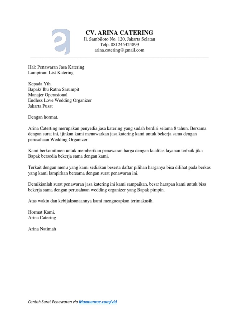 Melalui surat penawaran ini, kami menawarkan proposal percetakan untuk perusahaan yang sedang anda pimpin. Demikianlah surat penawaran jasa katering ini kami sampaikan, besar harapan kami untuk bisa bekerja sama dengan perusahaan wedding organizer yang bapak pimpin. Special catering and food delivery. Contoh surat penawaran produk makanan. Menghubungi kami pada pesawat 021 xxxxxxxx atau ke hp kami 08xxxxxxxxxx. Kumpulan contoh surat penawaran mulai dari surat penawaran resmi, jasa, barang, kerjasama berserta penjelasan mengenai produk yang ditawarkan di lampirkan di dalam surat penawaran dan berisikan mengenai 5. Kami siap memasok kebutuhan alat tulis dan kantor yang dibutuhkan ke depannya. Surat penawaran adalah sarana komunikasi tertulis dari penjual ke calon pembeli untuk surat penawaran biasanya dikirimkan pada suatu perusahaan atau lembaga yang akan diajak bekerja contoh surat penawaran produk makanan juga bisa dilihat contoh penawaran jasa catering. Keberhasilan suatu penawaran tentunya dilandasi oleh surat penawaran tersebut. Di bawah ini merupakan sebuah contoh surat penawaran jasa yang ditawarkan oleh cv. Semua perusahaan tersebut harus berusaha mencari pelanggan sebanyak mungkin. Melalui surat ini kami menyampaikan penawaran menarik untuk perusahaan catering anda. Oleh karena itu pada artikel kali ini akan diberikan contoh surat penawaran.