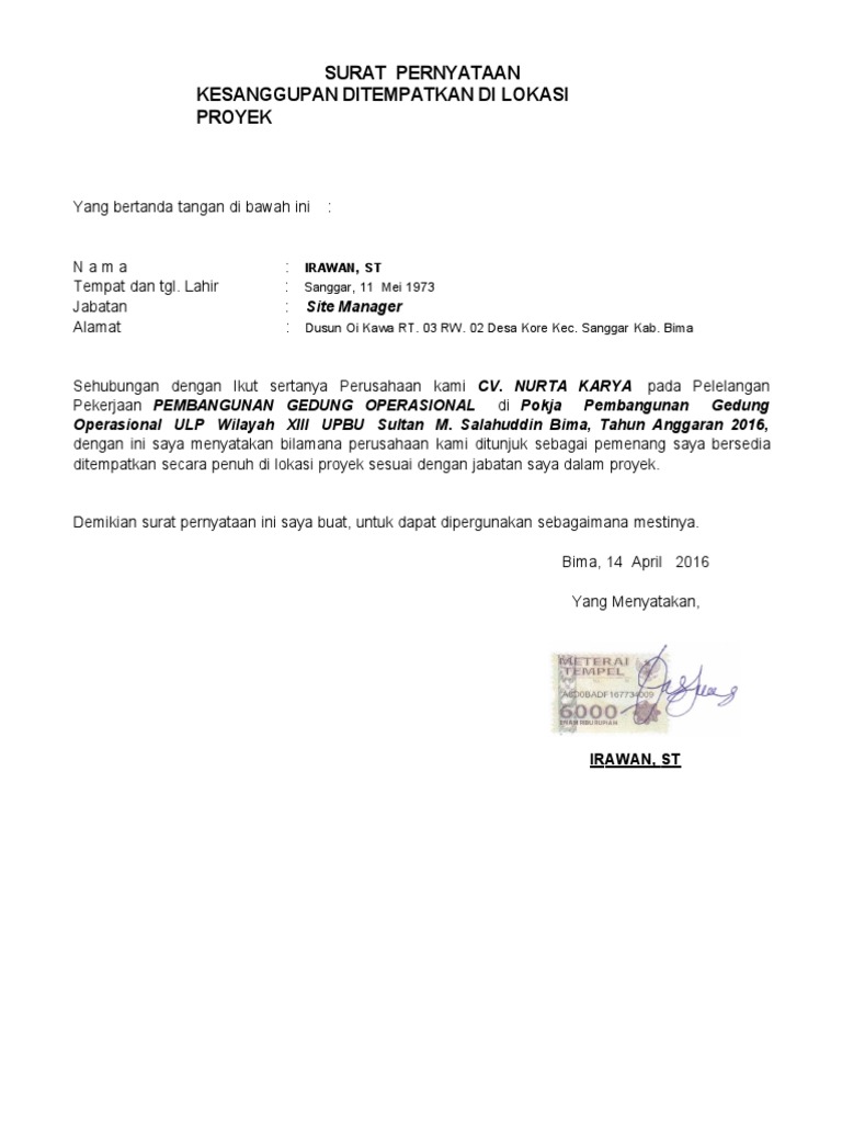 Dengan ini menyatakan bahwa telah melaksanakan instalasi genset dan persiapan test dan commissioning pada pekerjaan nama pekerjaan dan tahun anggaran dengan maksimal dan. Demikian surat pernyataan ini saya buat dengan sebenarnya dan apabila dikemudian hari ternyata pernyataan saya tidak benar, maka saya bersedia dituntut dimuka hakim sesuai dengan ketentuan dan hukum yang berlaku. Banda aceh, 10 maret 2015 yang membuat pernyataan, materai 6000 ikhsan. Insyaallah kita akan membahas semua contoh tersebut dalam artikel. Yang bertanda tangan di bawah ini: