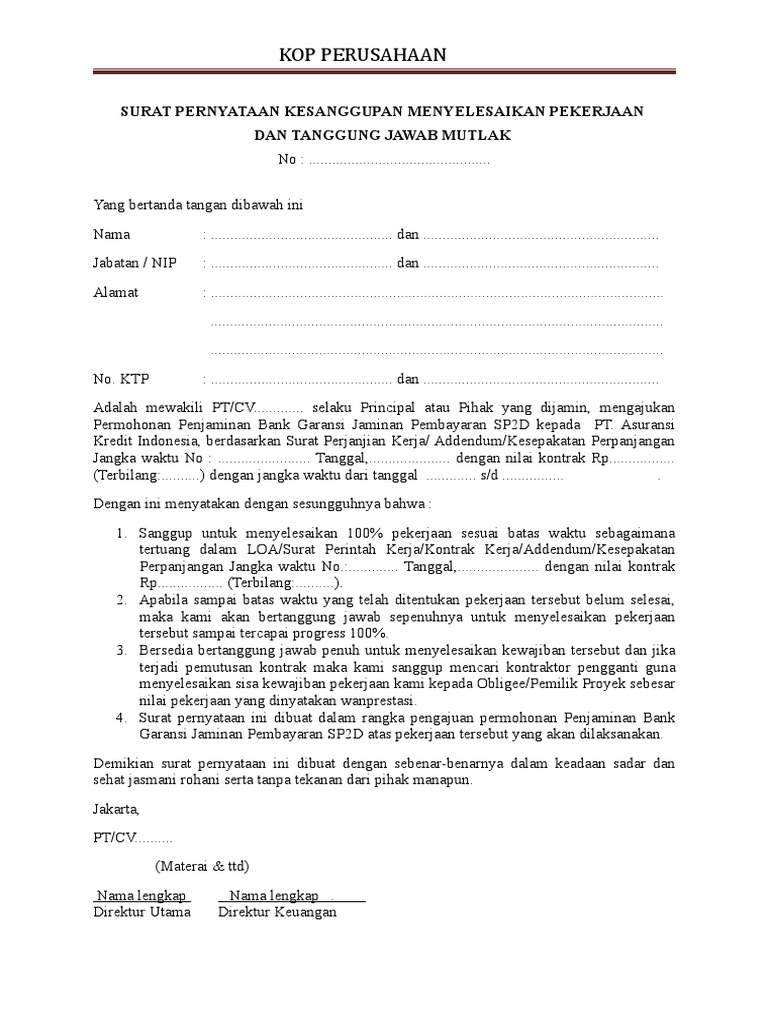 Demikian surat pernyataan ini saya buat dengan sebenarnya dan apabila dikemudian hari ternyata pernyataan saya tidak benar, maka saya bersedia dituntut dimuka hakim sesuai dengan ketentuan dan hukum yang berlaku. Rapat tersebut harus menyepakati antara lain, apakah pekerjaan tersebut dianggap perlu dilanjutkan, apakah penyedia memiliki kesanggupan menyelesaikan pekerjaan, dan apakah. Dengan surat ini, saya yang beridentitas di bawah ini: Contoh surat pernyataan bersedia menyelesaikan pekerjaan dengan denda. Contoh surat pernyataan adalah surat yang digunakan untuk menyatakan sesuatu kepada penerima. Untuk memberikan kepercayaan bagi pihak yang bersangkutan, surat pernyataan kesanggupan menjadi dokumen resmi yang dibutuhkan. Pengembalian uang untuk tuha peut dan tuha lapan sebesar rp. Surat ini biasanya berisi beberapa hal yang mencakup kesanggupan berkaitan dengan bekerja lembur, bersedia dikontrak selama beberapa waktu. Contoh surat pernyataan kesanggupan menaati peraturan. Surat pernyataan adalah sebuah dokumen surat yang dibuat berdasarkan segala hal yang ingin dinyatakan oleh pihak yang bersangkutan dengan tujuan tertentu. Pengertian, tujuan, manfaat, dan contoh suratnya. Surat pernyataan adalah surat yang dibuat oleh seseorang yang berisi pernyataan dirinya atau menerangkan orang lain bahwa orang tersebut pernah atau tidak pernah salah satu contoh surat pernyataan yang akan dibahas pada kesempatan kali ini adalah surat pernyataan kesanggupan. Surat pernyataan kesanggupan harus mencatumkan sebuah pernyataan secara jelas akan kesanggupan untuk melakasanakan tugas yang akan diberikan serta mau menanggung resiko apapun baik berupa hukuman atau hal lainnya jika terbukti bersalah atau gagal dalam menjalankan tugas.