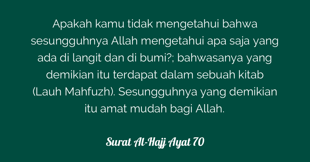 Surat Al Hajj Ayat 70 : Surah Al Hajj ayat 70 QS. 22:70 » Tafsir Alquran (Surah ... - Bahwasanya yang demikian itu terdapat dalam sebuah kitab.. أَلَمْ تَعْلَمْ أَنَّ اللَّهَ يَعْلَمُ مَا فِي السَّمَاءِ وَالْأَرْضِ ۗ إِنَّ ذَٰلِكَ فِي كِتَابٍ ۚ إِنَّ ذَٰلِكَ عَلَى اللَّهِ يَسِيرٌ. 1:33:17 kasdw recommended for you. Ada beberapa surat yang diberi nama lebih dari satu oleh rasulullah. Dengan menyebut nama allah yang maha pemurah lagi maha penyayang. 70) allah ta'ala mengabarkan tentang kesempurnaan…